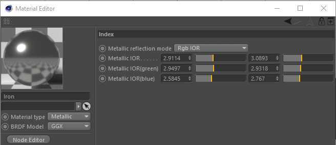 They all are set to use the most advanced IOR mode in the Metallic Material, with all the proper values typed into each of the 6 N (Reflective Index) and K (Extinction Coefficient) inputs, respectively, for each material.